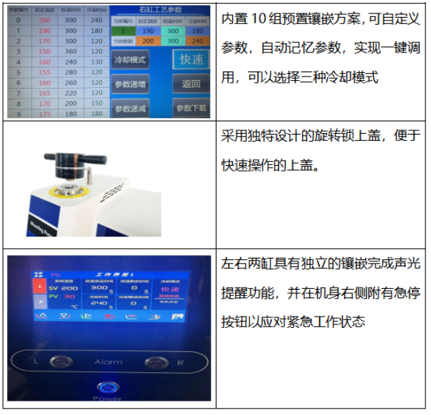 ZXQ-3Y型自动镶嵌机是一款先进的双工位液压水冷式自动试样镶嵌设备,可一次性镶嵌4个试样,极大地提高了制样效率。独特的冷热分离设计,将样品镶嵌时间缩短到6分钟以内,大大提高了工作效率,镶嵌过程由全自动程序进行控制,实现了加热、加压、保压、冷却、卸压等镶嵌过程的一键式操作,无需操作人员值守,自动完成试样镶嵌。该机采用自主研发的低噪音液压站加压,保压,镶嵌样品表面光亮如镜,制样成功率高。高清触摸屏显示及控制,实时显示温度和系统状态,镶嵌方案可保存,调取方便;配备强制水冷却系统,制样速度快,采用独特设计的旋转锁上盖,安全性更高,操作更方便,性能稳定,是试样镶嵌的理想设备。
